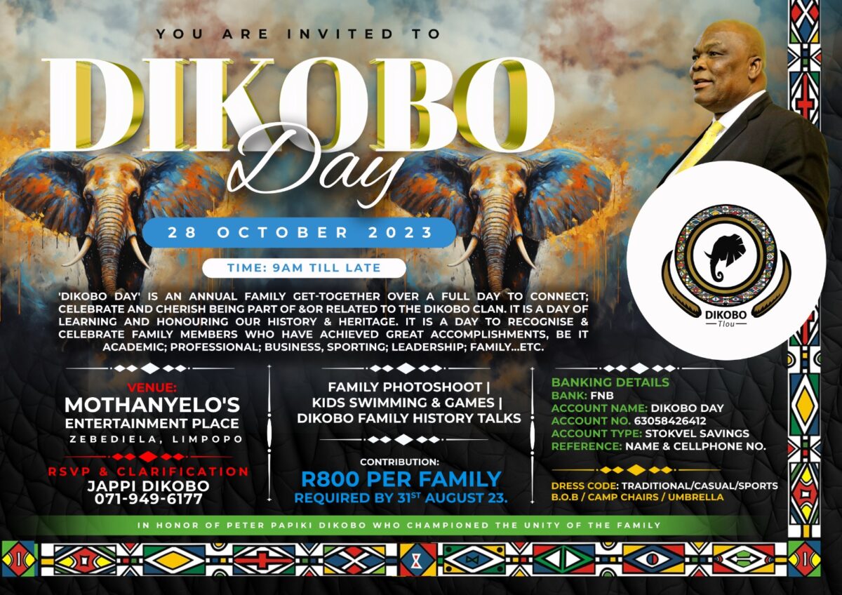 ‘Dikobo Day’ is an annual Family get-together over a full day to Connect; Celebrate and Cherish being part of &/or related to the Dikobo Clan. It is a Day of Learning and honouring our history & heritage. It is a day to recognise & celebrate family members who have achieved great accomplishments, be it academic; professional; business, sporting; Leadership; family…etc.